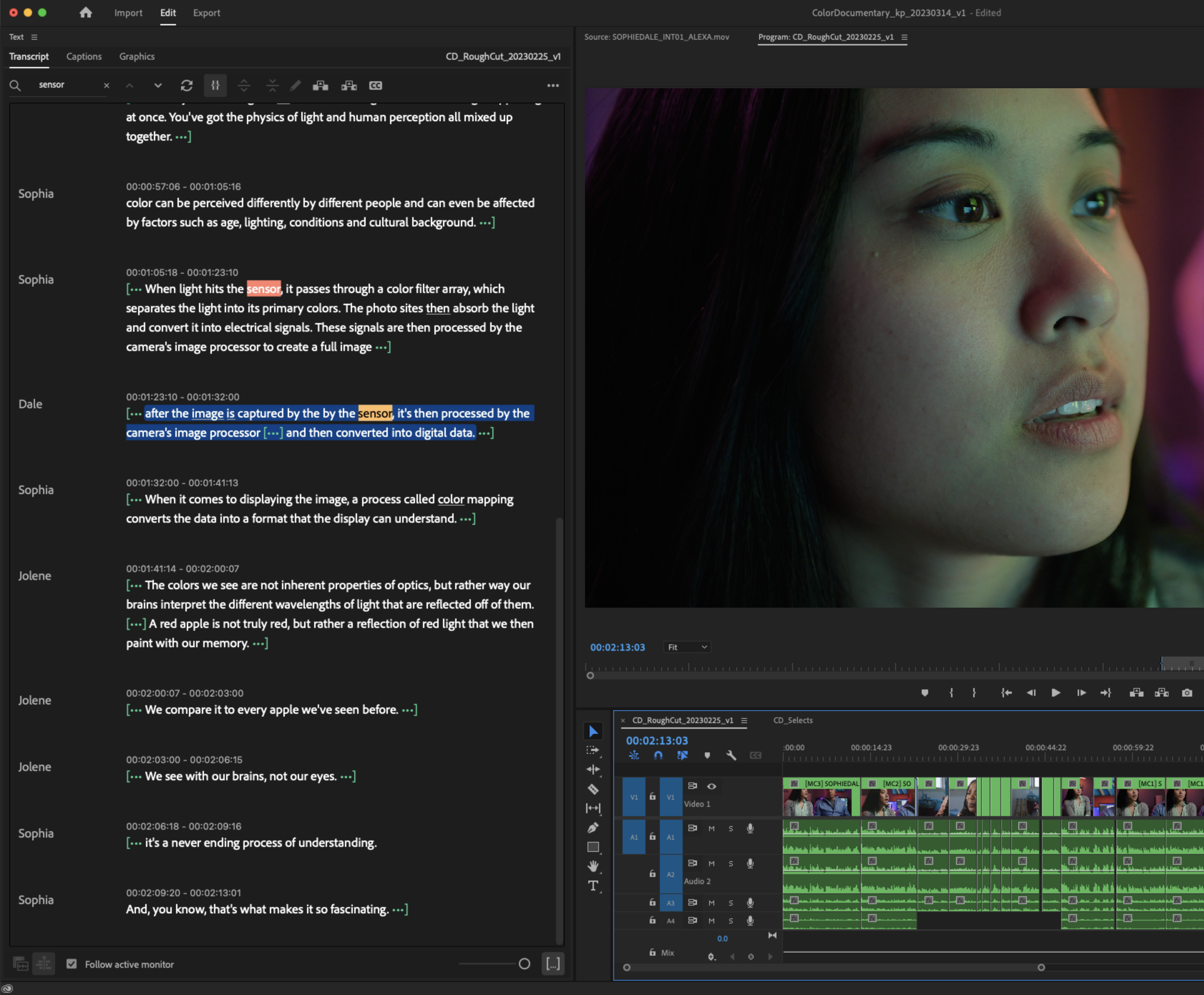 The first step in most video editing projects is selecting the content you want and arranging it on the Timeline to create a “rough cut.” Text-based editing allows you to do this quickly and efficiently. By transcribing your source media, you can easily add clips, edit sequences, and refine your edits using text-based commands.